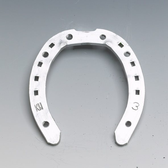Svensktillverkad härdad aluminiumsko med sex broddhål.