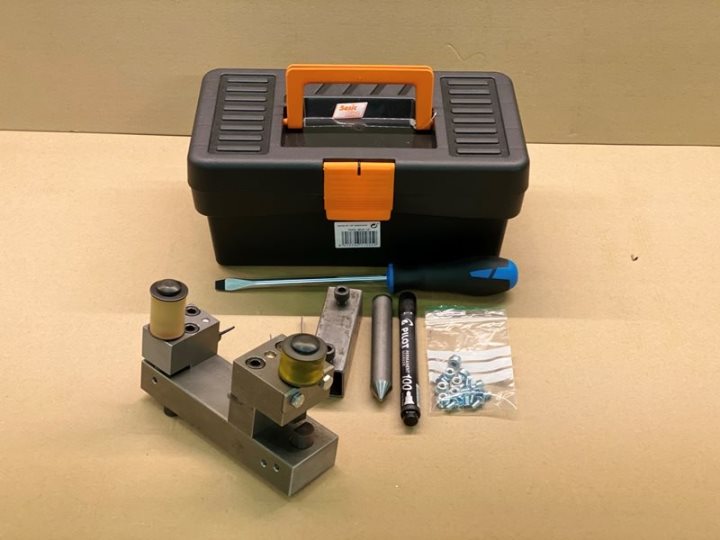 Komplett verktygssats för PG beslag. Verktyget sätts fast som det är i ett städ, eller via medföljande hållare kan det skruvas fast i ett skruvstycke. Använd verktyget för tillpassning och utstansning av sömhål i PG metallplatta samt utbyte eller fastsättning av lösa gängnitar. Verktyget går att ställa in för att lätt kunna placera hålen där de önskas. Använd verktygets skärfunktion för att formatera metallplattan, det medföljer en klämma för inställning så att även tunnare 2mm plåtar kan formateras.